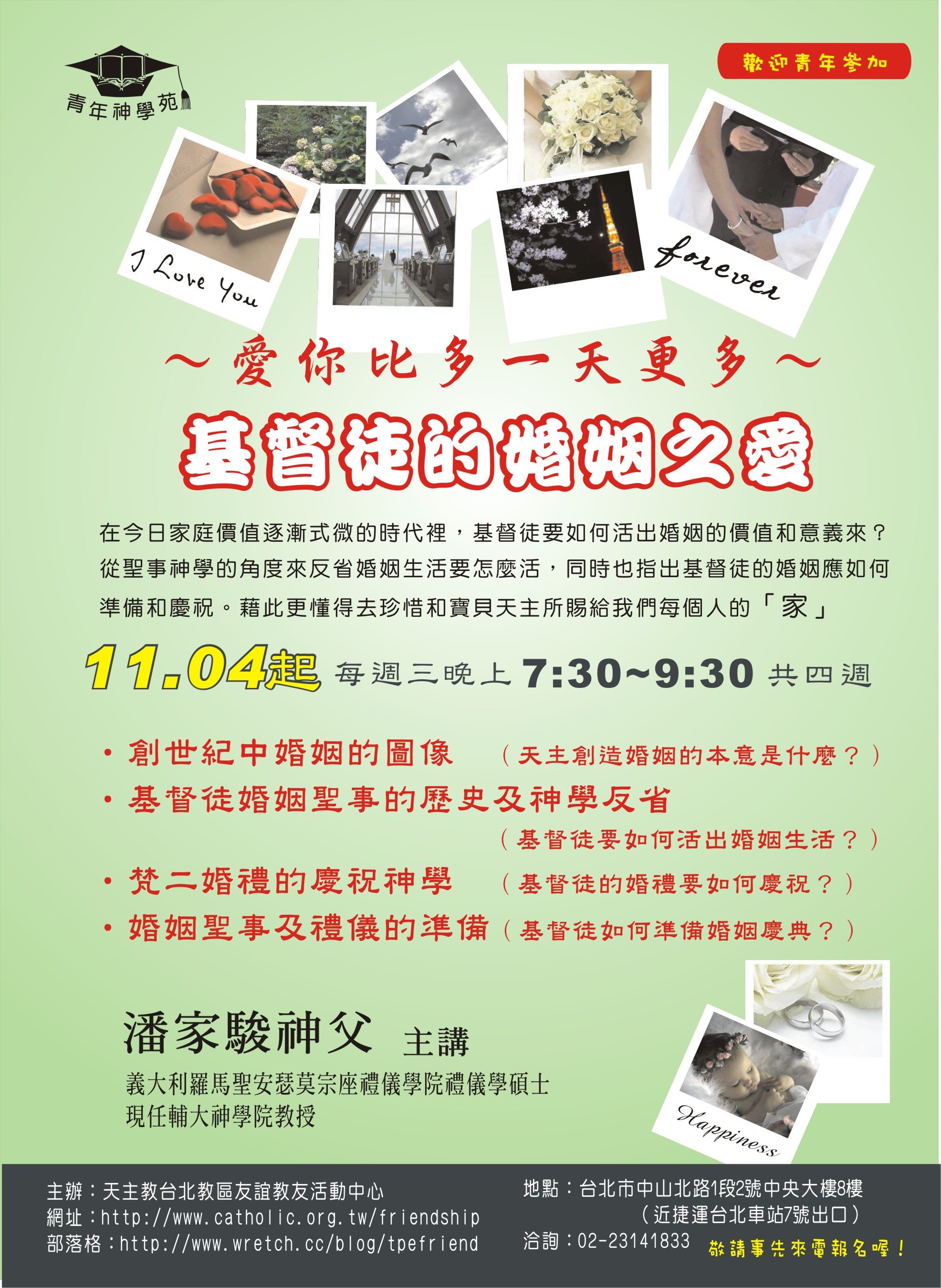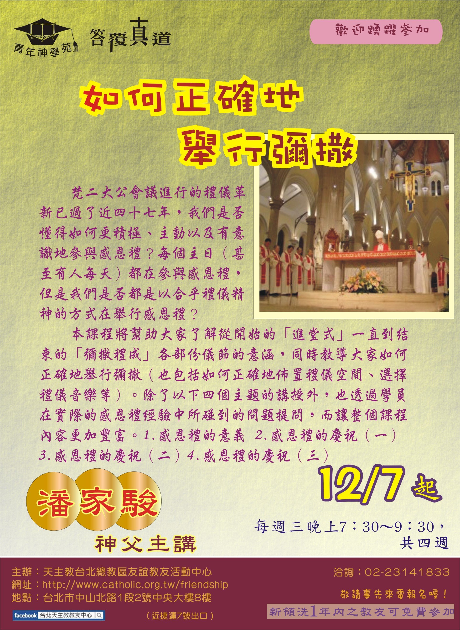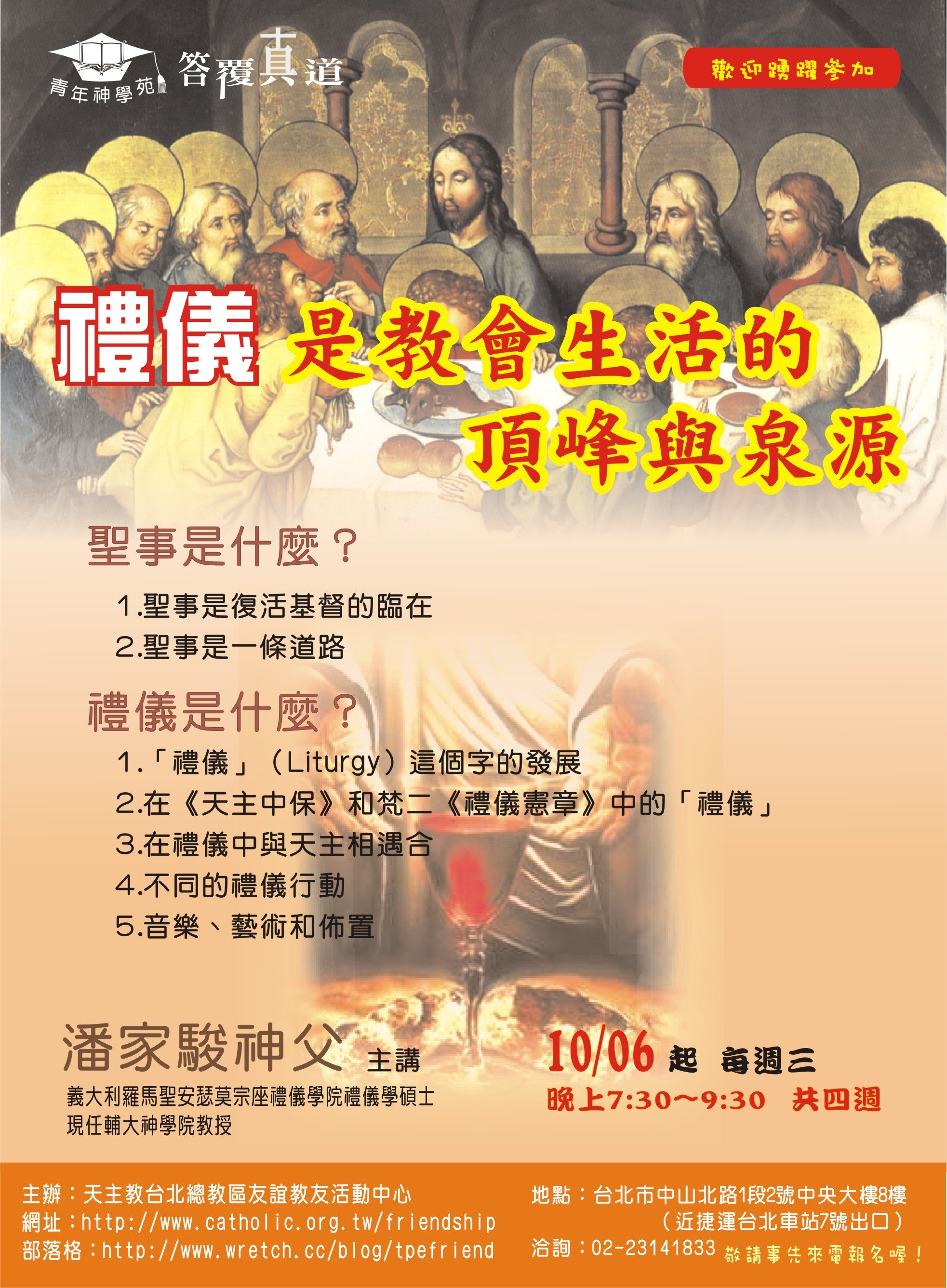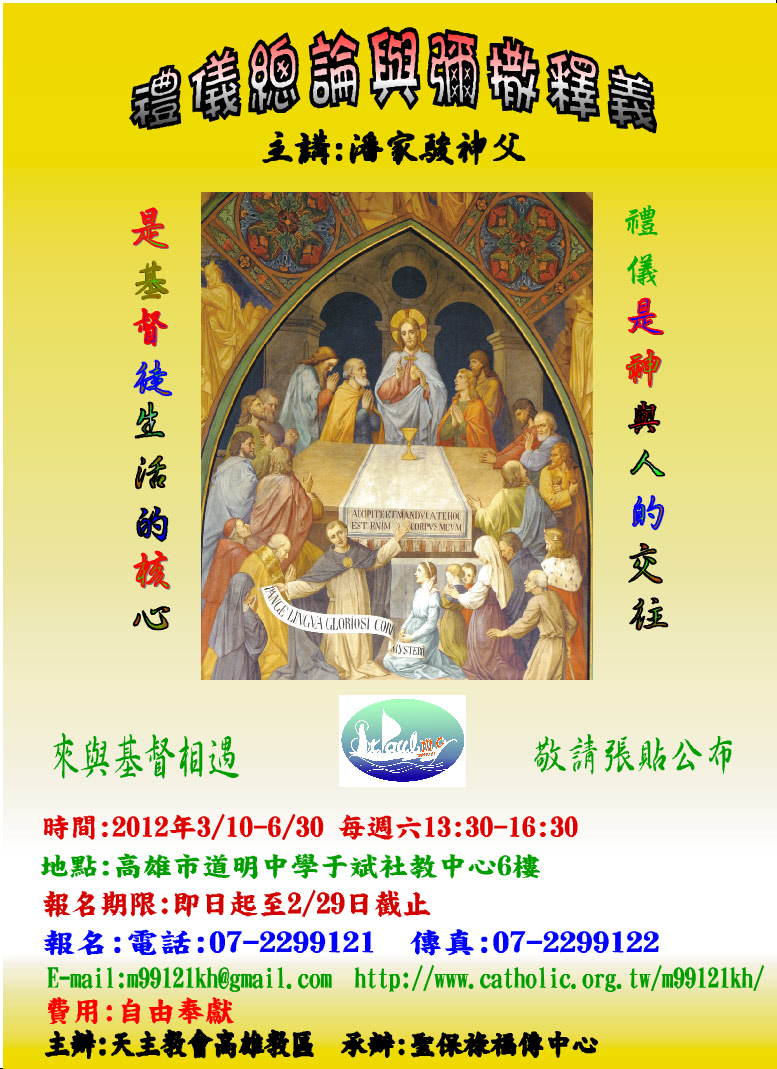 * 臺北牧靈中心:聖體服務員進階培訓(2014/03/18 起共十三次) * 耕莘醫院:患病者的靈性關懷──天主教聖事禮儀之服務(2013/05/31-06/01) * 聖保祿福傳中心:聖事的牧職省思(2013/04/13 起共六次) * 友誼教友中心:婚姻聖事與禮儀(2012/12/05 起共四次) * 友誼教友中心:教會生活的頂峰與泉源(2012/05/09起)(一)(二)(三)(四)(五) * 臺北牧靈中心:聖像畫靈修(2012/04/12 起共九次) * 聖保祿福傳中心:禮儀總論與彌撒釋義(2012/03/10 起共十次) * 臺北牧靈中心:臨終關懷與殯葬禮儀(2012/03/06 起) * 友誼教友中心:如何正確地舉行彌撒(2011/12/07 起共四次) * 友誼教友中心:禮儀是教會生活的頂峰與泉源(2010/10/06 起共四次) * 友誼教友中心:基督徒的婚姻之愛(2009/11/04 起共四次) * 友誼教友中心:基督徒的婚姻之愛(2008/10/08起共四次) * 友誼教友中心:感恩聖事的尋根探源(2007/09/05 起共四次) * 友誼教友中心:婚姻神學(2006/11/09 起共四次) |