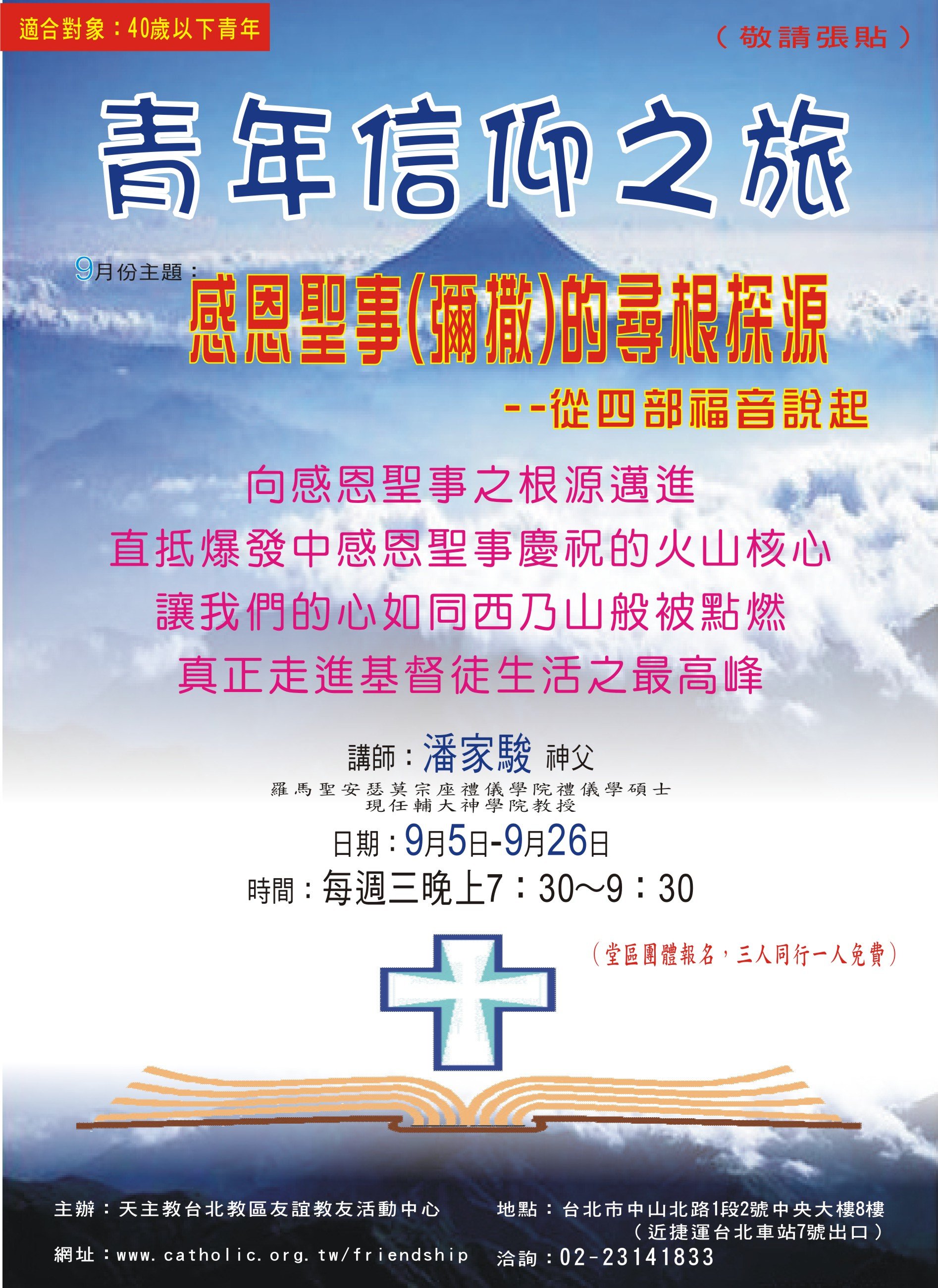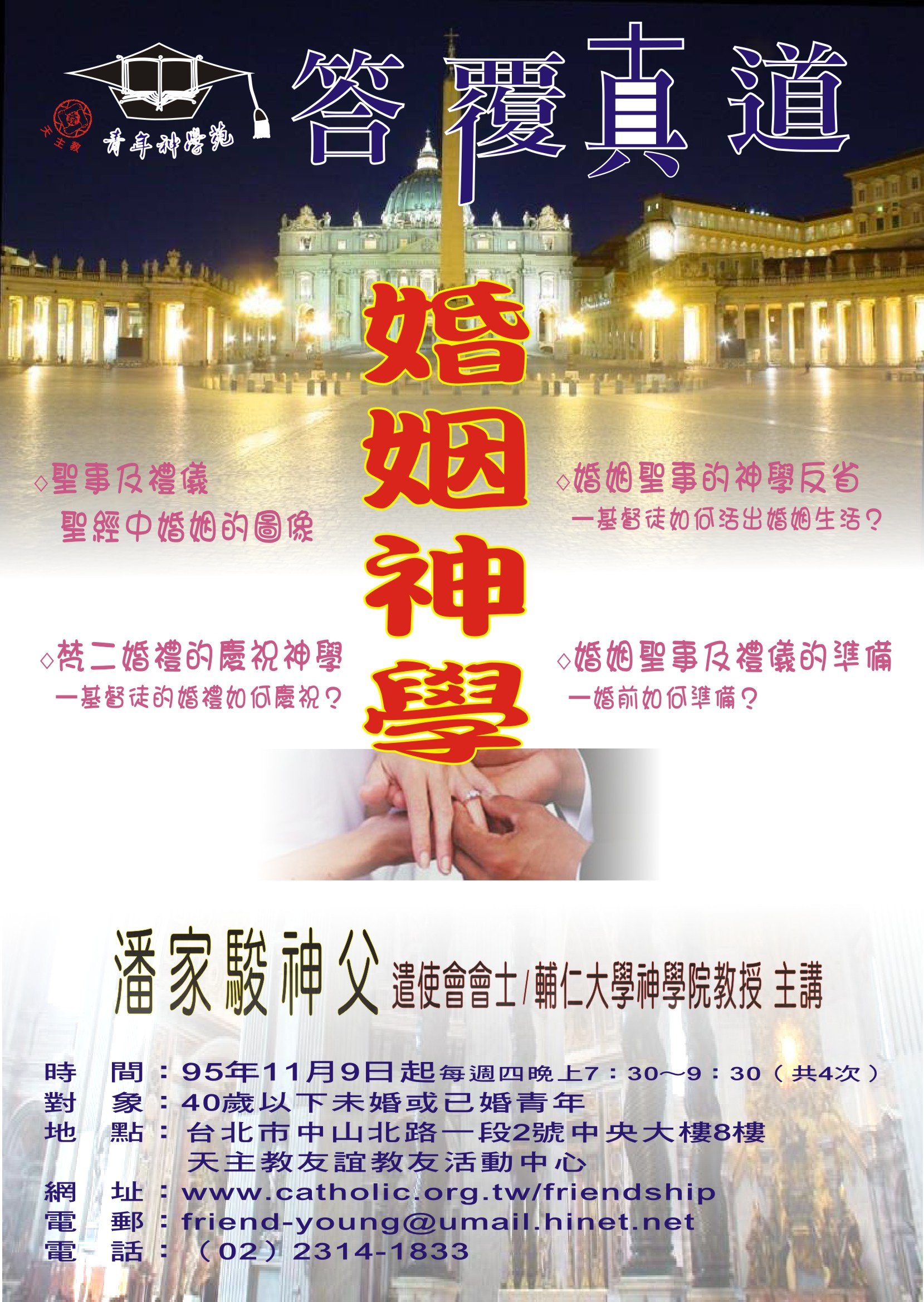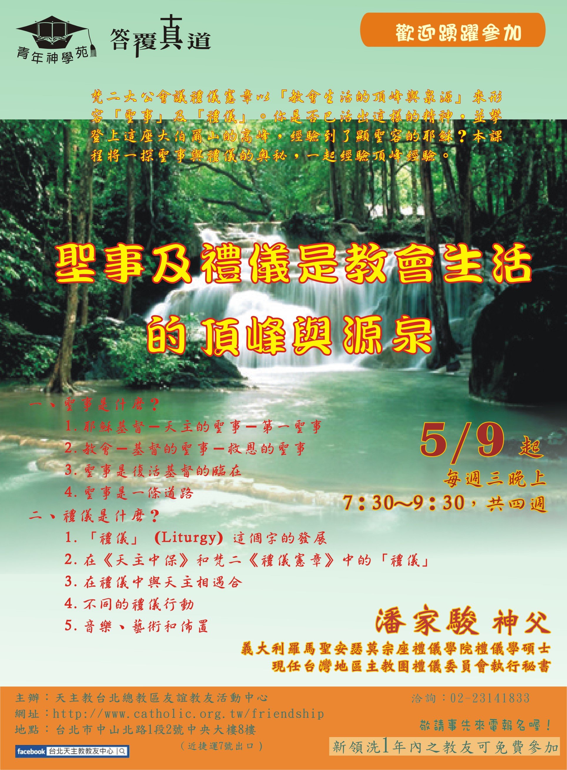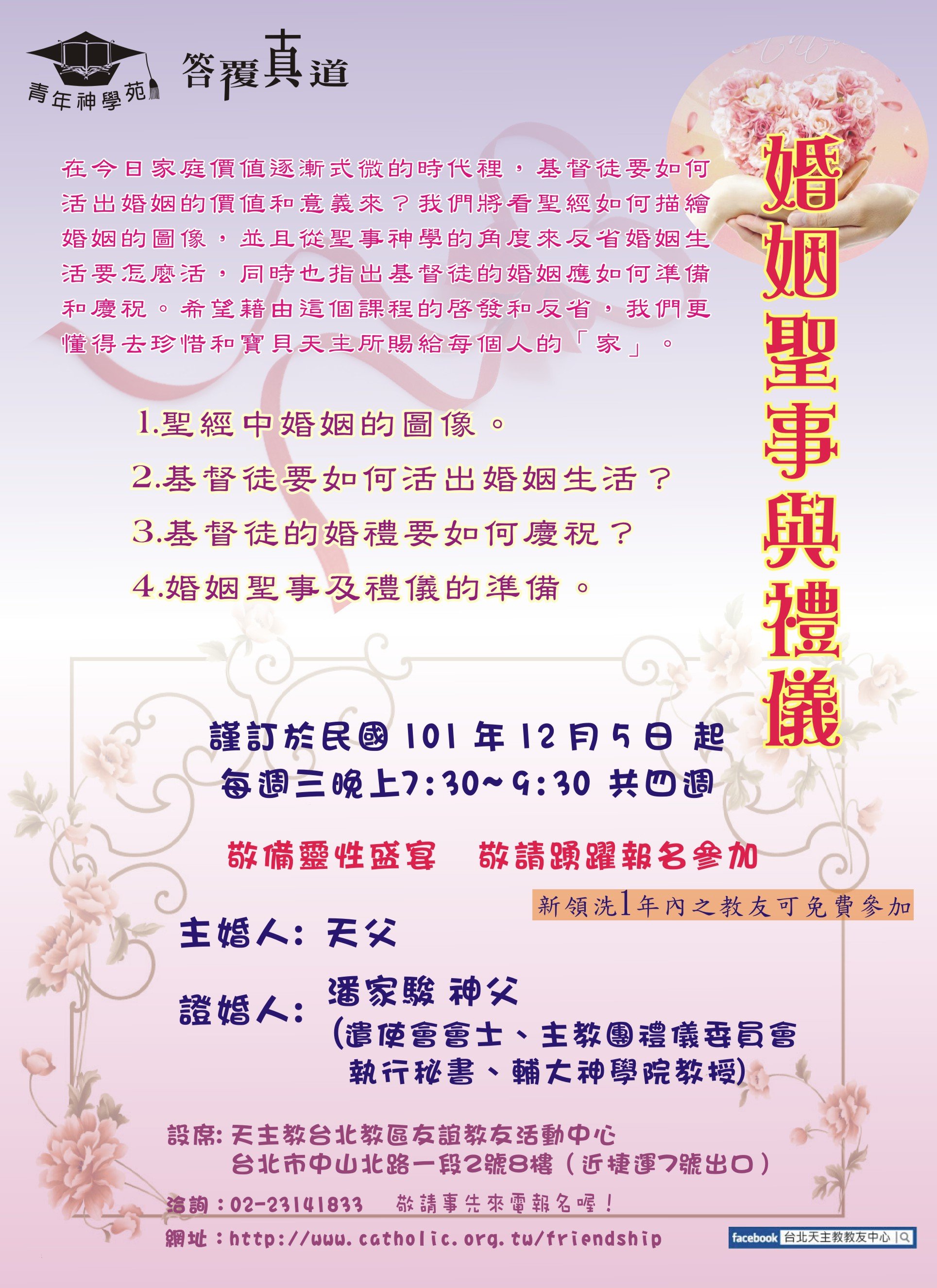 * 臺北牧靈中心:聖體服務員進階培訓(2014/03/18 起共十三次) * 耕莘醫院:患病者的靈性關懷──天主教聖事禮儀之服務(2013/05/31-06/01) * 聖保祿福傳中心:聖事的牧職省思(2013/04/13 起共六次) * 友誼教友中心:婚姻聖事與禮儀(2012/12/05 起共四次) * 友誼教友中心:教會生活的頂峰與泉源(2012/05/09起)(一)(二)(三)(四)(五) * 臺北牧靈中心:聖像畫靈修(2012/04/12 起共九次) * 聖保祿福傳中心:禮儀總論與彌撒釋義(2012/03/10 起共十次) * 臺北牧靈中心:臨終關懷與殯葬禮儀(2012/03/06 起) * 友誼教友中心:如何正確地舉行彌撒(2011/12/07 起共四次) * 友誼教友中心:禮儀是教會生活的頂峰與泉源(2010/10/06 起共四次) * 友誼教友中心:基督徒的婚姻之愛(2009/11/04 起共四次) * 友誼教友中心:基督徒的婚姻之愛(2008/10/08起共四次) * 友誼教友中心:感恩聖事的尋根探源(2007/09/05 起共四次) * 友誼教友中心:婚姻神學(2006/11/09 起共四次) |